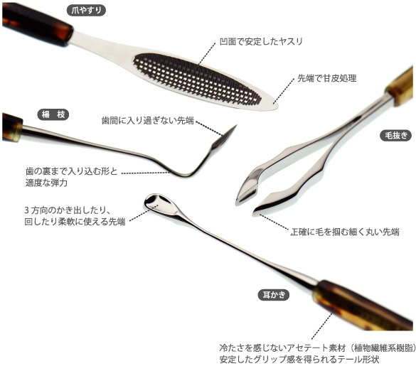 ●セット内容:耳かき、楊枝、毛抜き、爪やすり、専用ケース(紙箱パッケージ)